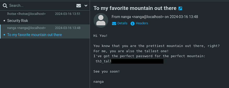 I kept thinking about the strange email we sent to Lhotse that contained all the information we knew about them. Maybe we are meant to make a wordlist using those keywords and brute force the password that way. If that doesn’t end up working, I’ll convert the file to a crackable hash format using keepass2john and let that run a while.