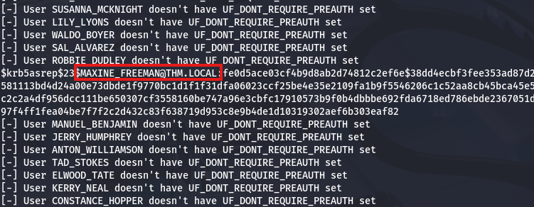 Next, let’s check if any of these accounts have Kerberos pre-authentication disabled so we can grab NTLM hashes. I get hits back for the users MAXINE_FREEMAN, PHYLLIS_MCCOY, QUEEN_GARNER, ISIAH_WALKER, and SHELLEY_BEARD.