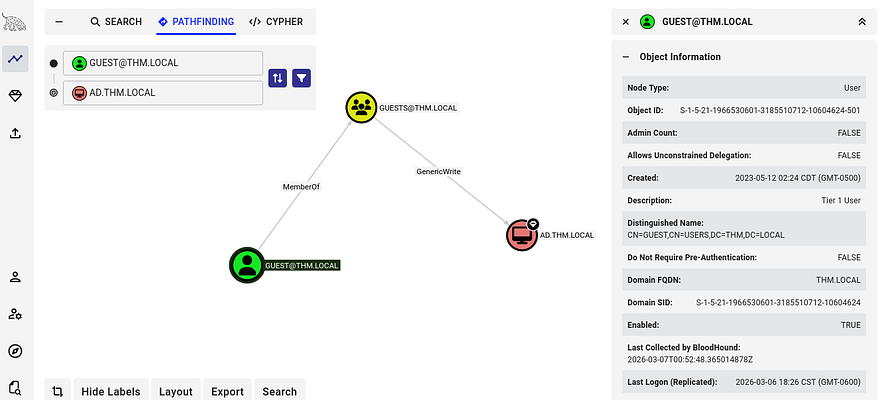 It gets overlooked quite often, but the Guest account is worth enumerating to see if they have access to important stuff. Interestingly, by using the pathfinding tool, I discover that that user is a member of the Guests group which has GenericWrite access over the AD domain. With this write access enabled, we can effectively modify the msDS-AllowedToActOnBehalfOfOtherIdentity attribute of the Domain Controller in order to carry out a Resource-Based Constraint Delegation (RBCD) attack.