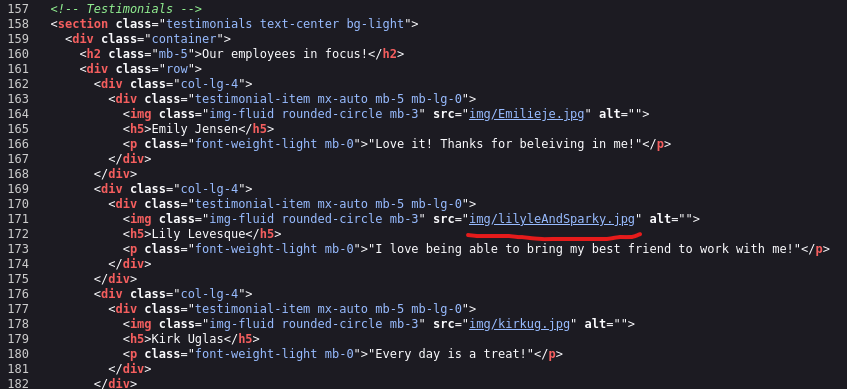 Taking some more time to look around shows that we can reset an account password if we answer a security question. One of the photos under the “Employees in focus” tab has a photo with her dog, checking the image’s source name gives us the dog’s name. I should also note that the name structures employees as first name + two letters of the last name, here it is img/lilyleAndSparky.jpg which may be the company’s username structure.