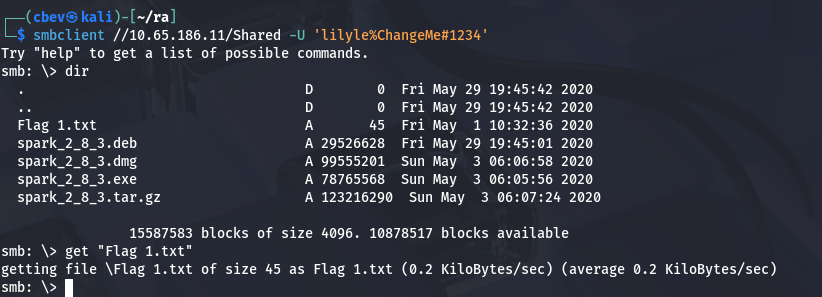 In order to use IgniteRealtime Spark we must download the client which is conveniently in the same SMB share we got the flag in. I couldn’t get Kali to recognize JRE 8 as a valid dependency for the life of me so I switched to the Attack Box for this step.