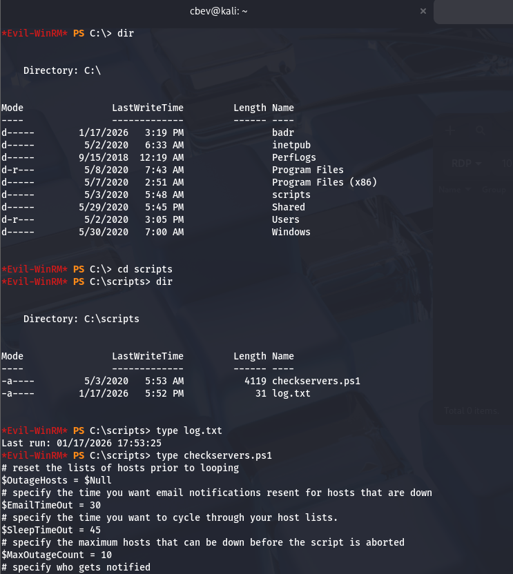 Here we can grab the second flag under their Desktop folder and start looking for privilege escalation to Administrator. There’s nothing else in the home, however I do find a non-standard directory on the C:\ drive which holds scripts.