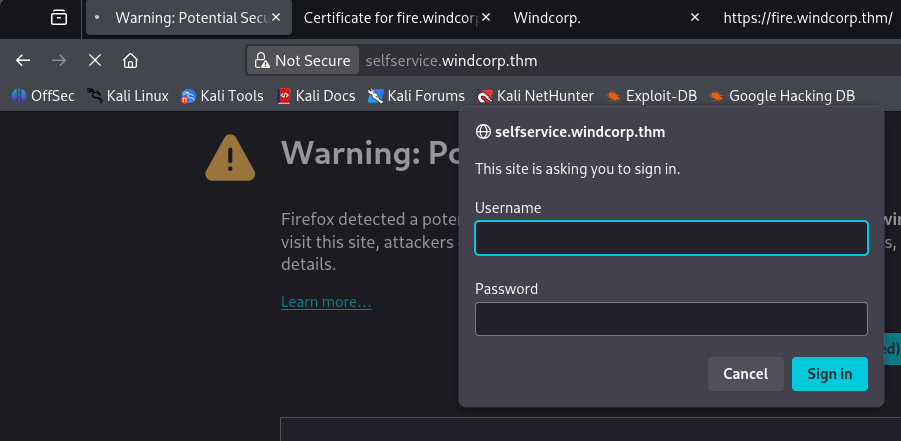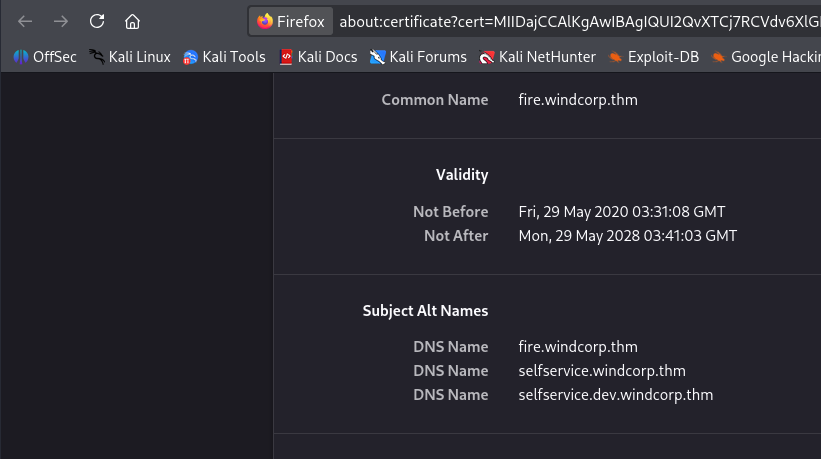 Heading to the webpage on port 80 redirects us to https://fire.windcorp.thm. Checking the certificate leaks two more subdomains of selfservice.windcorp.thm and selfservice.dev.windcorp.thm .