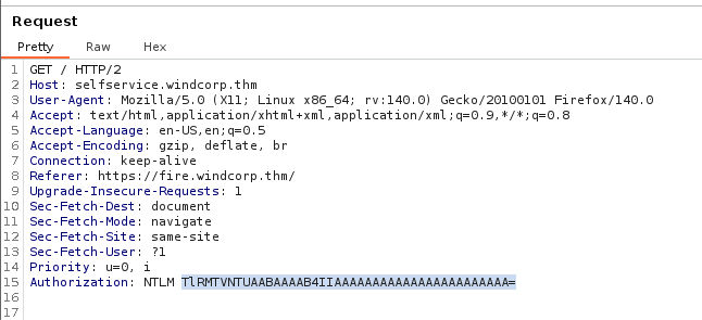 I start testing logins at each site, capturing the requests in Burp Suite and find that the selfservice.dev domain sends an Authorization header that contains the users NTLM hash.