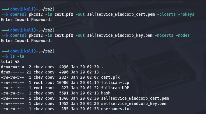 openssl pkcs12 -in cert.pfx -out selfservice_windcorp_cert.pem -clcerts -nokeys