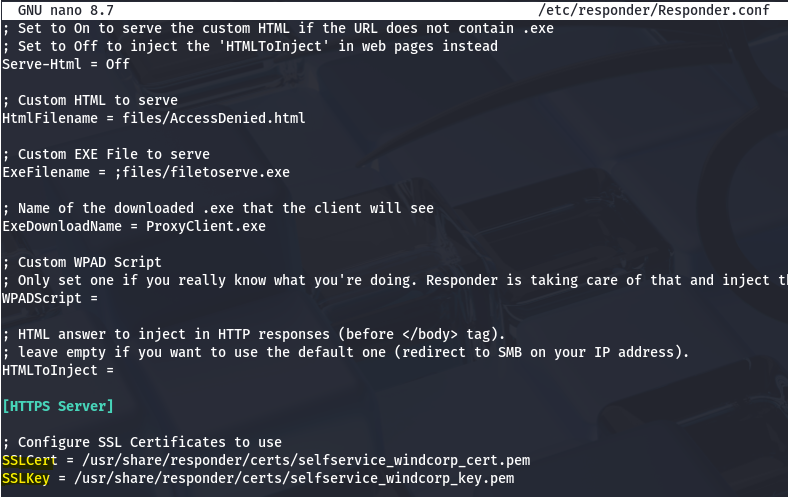 Next, update the bottom lines of your Responder.conf file (default on Kali is /etc/responder/Responder.conf ) to point towards the extracted key and cert.