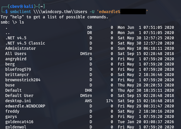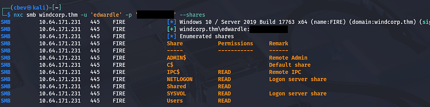 Before attempting these creds on the site or other applications, I try to authenticate to SMB which gives us a list of users on the box as well as an another share which is empty.
