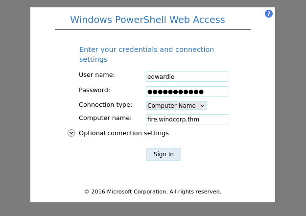 Heading over to the Powershell web portal, we can login with ed’s creds and by specifying the computer name of fire.windcorp.thm.