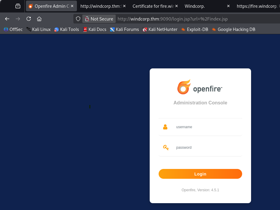 I’m guessing the selfservice.windcorp.thm site is for normal signons and the dev version is for devs/admins, however we don’t have creds yet. Ports 9090 (HTTP) & 9091 (HTTPS) show an admin login panel for openfire, which looks to be an instant messaging server.