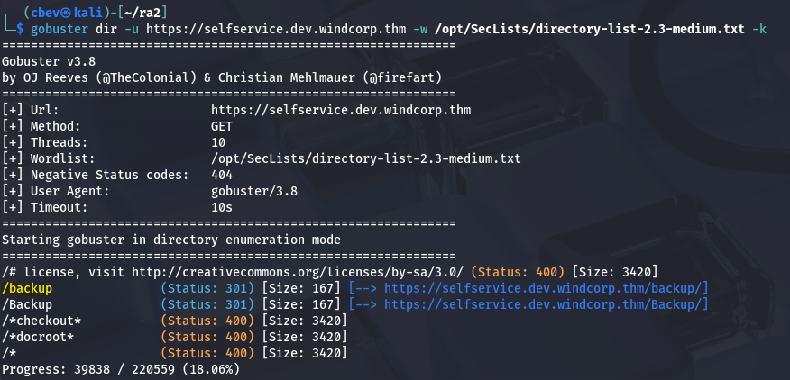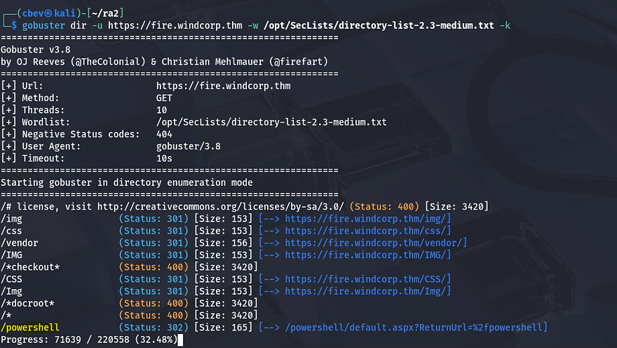 There is a ton of info to go off of here and most notably, this is almost the exact same setup as the previous box (Ra 1) which does make sense. I add fire.windcorp.thm to my /etc/hosts file and fire up directory/subdomain searches to sit in the background.