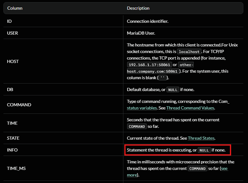 After taking a little break and a deep dive on MariaDB’s information_schema database revealed the PROCESSLIST table. This contains detailed information about running threads, which including their current state and execution time. Most of the columns inside that table are just technical data being used by the process in order to perform tasks, however the INFO column holds a statement that the thread is executing (potentially being NULL if none is provided).