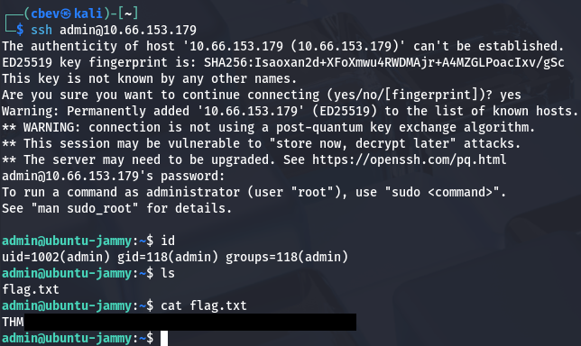 Running this a few times until getting the response we’re looking for shows that it’s a success. It’s far from perfect but it still works to grab the plaintext string from the statement. As suspected, the site itself does not handle the hashing process which leaves this susceptible to our attack. All that’s left is to SSH onto the box as the admin user and grab our well-earned flag to complete this challenge.