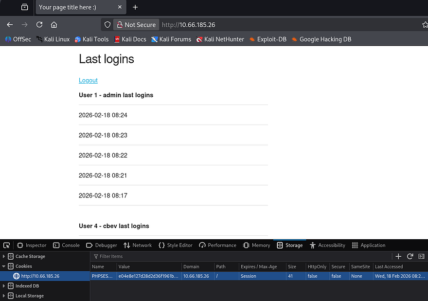The only thing displayed here is the last login times for all users registered on the site. The main page says that the login functionality is being monitored (presumably by the admin) so maybe we’re supposed to use cross-site scripting in order to steal the administrator’s cookie.