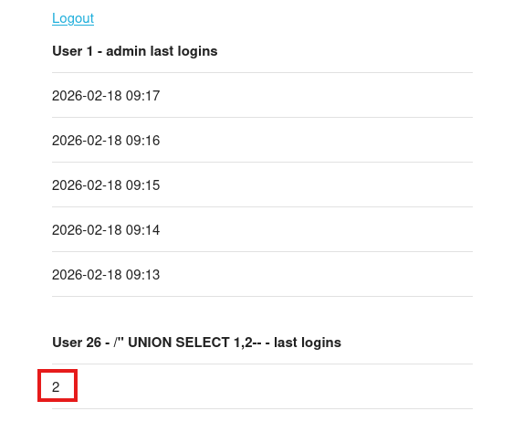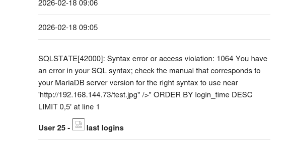 Reverting to a simpler payload shows that the image gets loaded, but another interesting thing is the presence of a SQL syntax error. Judging by where the error starts, we can assume that “ is a bad character that breaks the query whenever loading last login information.