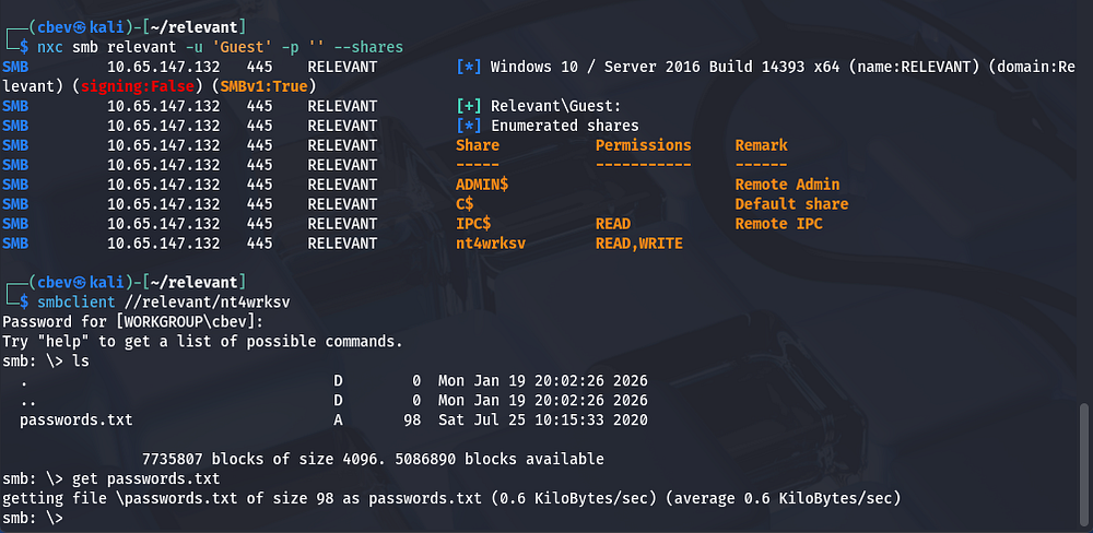 I also find a domain name of Relevant so let’s add that to our /etc/hosts file. I’ll start by enumerating SMB shares and any NFS mounts on rpc ports as it’s pretty quick to check before heading over to the webpages.