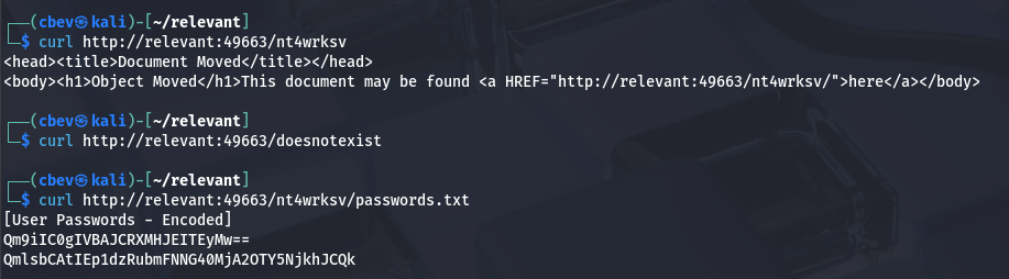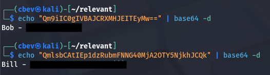 Guest authentication is enabled on SMB and we have read/write permissions on a network server share. Inside is a list containing two base64 encoded passwords for users Bill and Bob.