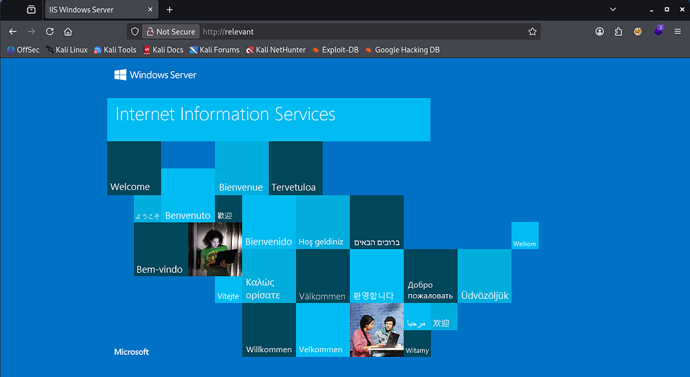 Looking at the landing page for the web server on port 80 shows a typical Microsoft IIS server page. I leave directory and subdomain searches in the background to save some time while heading over to the second one.
