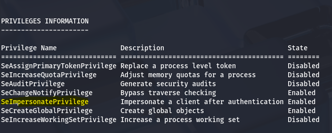 Listing privileges for the IIS account shows that we have access to SeImpersonatePrivilege. This is pretty common for service accounts as they need it to act on behalf of the system.
