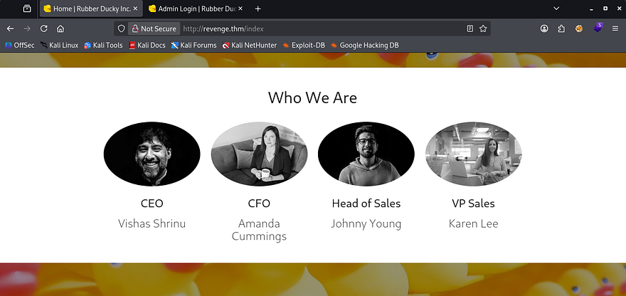 Checking the landing page gives us a few names of organization members. The page also seems like it’s static as the login panel doesn’t respond whatsoever.