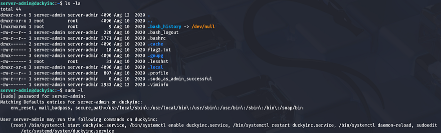 We can grab the second flag in their home dir and start looking for ways to grab root and deface the webpage. Listing Sudo commands show that we have full Sudo permissions on the systemctl binary for duckyinc.service.