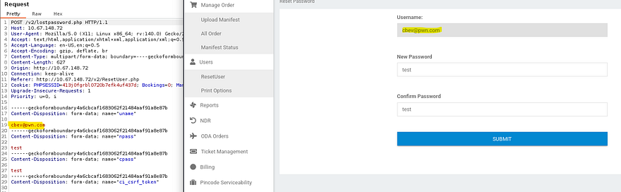 The cookie looks pretty insignificant as well. I move onto the ResetUser page and find that our username is greyed out within the site, however intercepting this shows we have the ability to change the value of that specific form to be whatever we please.
