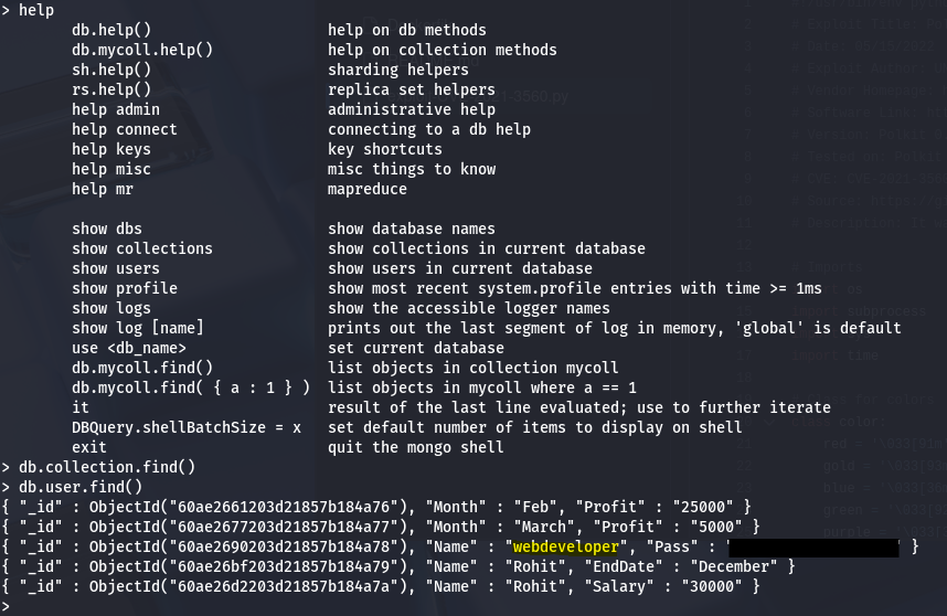 Checking for files owned by webdeveloper displays a few binaries pretaining to mongodb, which I thought was a little wierd. Using mongo to dump that a user table in a backup DB rewards us with the plaintext password for the webdev account.