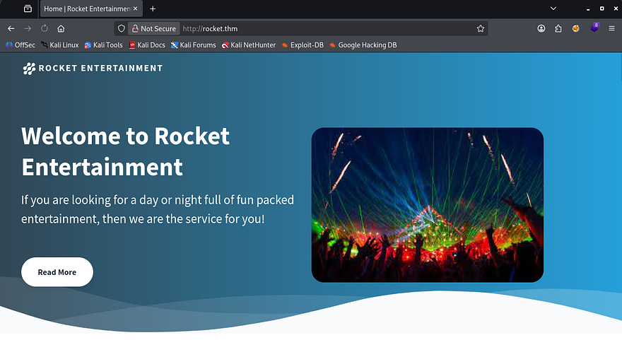Default scripts show that the site redirects us to rocket.thm so I add that to my /etc/hosts file. I also fire up Gobuster to start searching for subdirectories/subdomains in the background before heading over to the webpage. The landing page is a typical site for a company selling services, they seem to offer entertainment packages interested customers.