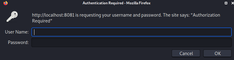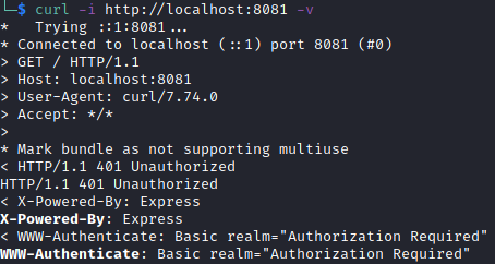 Once that’s all set up, we can visit the site by going to localhost:8081 in a browser or using a tool like cURL. Looks like we need authentication before we can access the MongoDB Web Interface.