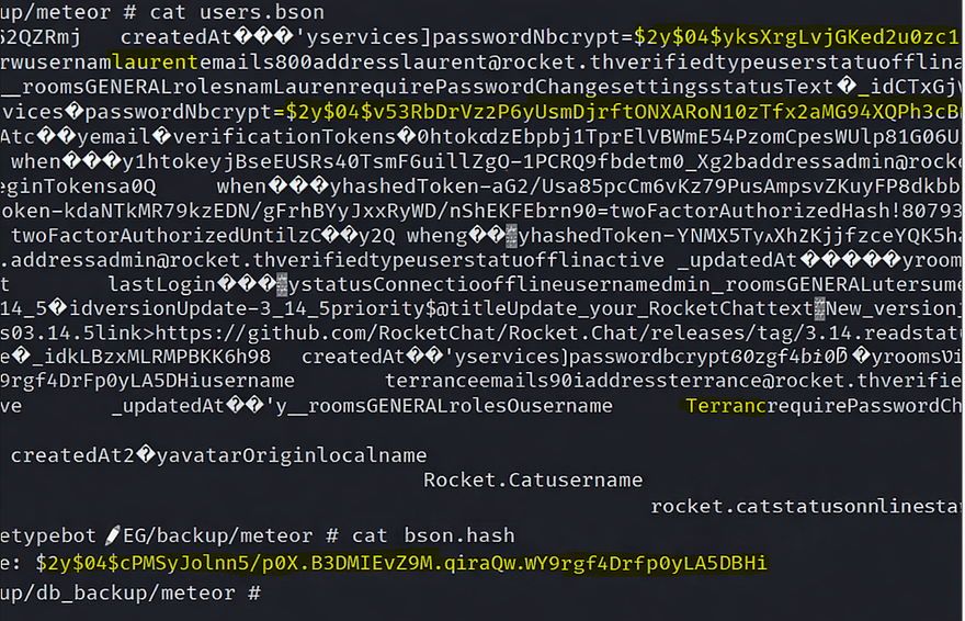 Once we have a shell through that, I head towards any files containing BSON information to grab any credentials/hashes. Inside of /backup/backup_db/meteor/ is a users.bson file which gives us bcrypt hashes for Laurent and Terrence.