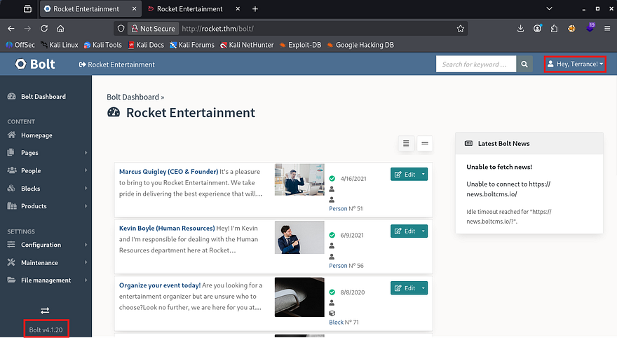 Only one of them cracks, so now we need somewhere to use it. While enumerating the site at the beginning of this challenge, Wappalyzer showed that it was built using BoltCMS. The default login page for apps using that is /bolt, let’s try supplying those new-found credentials there.