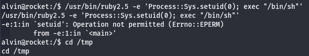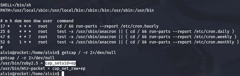 At this point we can grab the user flag under Alvin’s home directory and start looking at ways to escalate privileges to root user. Checking the usual things such as SUID bits set, crontabs running personal scripts, or unsecured backups revealed nothing. I did find that the Ruby binary had the cap_setuid+ep capability set on it, meaning that we could execute Ruby code as root.