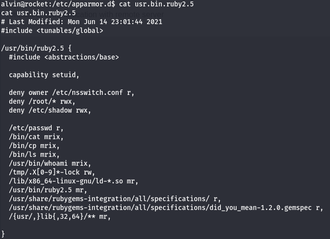 Checking the configuration file for AppArmor on Ruby v2.5 shows a few permissions regarding files/directories. In particular, we have access to read and write files using this binary to the /tmp directory if the file starts with .X[0–9] and ends with -lock. We can exploit this to copy other binaries to /tmp under the guise of valid files and change the SUID bit so that we’re able to execute it as a privileged user.
